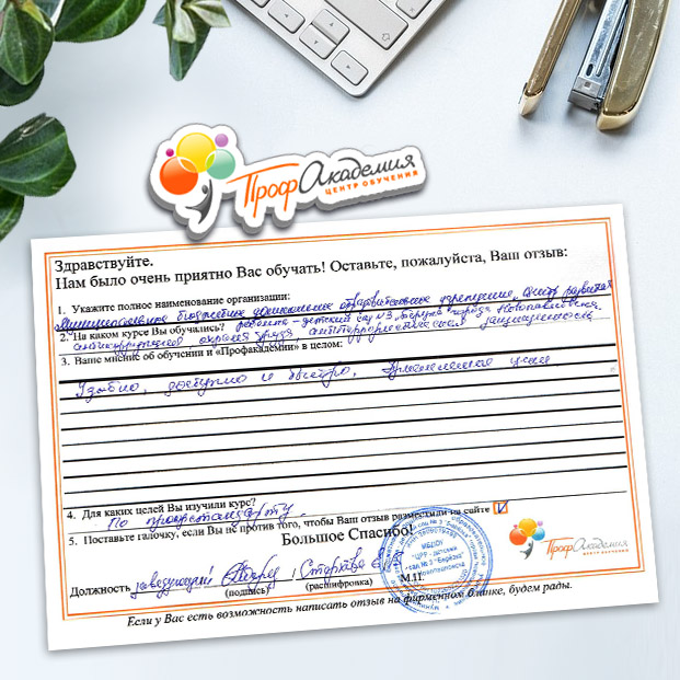 Огромное спасибо за курс обучения по данной тематике. Все было очень понятно, доступно и организованно. Материал предоставлен в доступном объеме, дополнительная была возможность проверить свои знания в решении тестовых заданий. Спасибо куратору Елене за качественное и актуальное обучение.