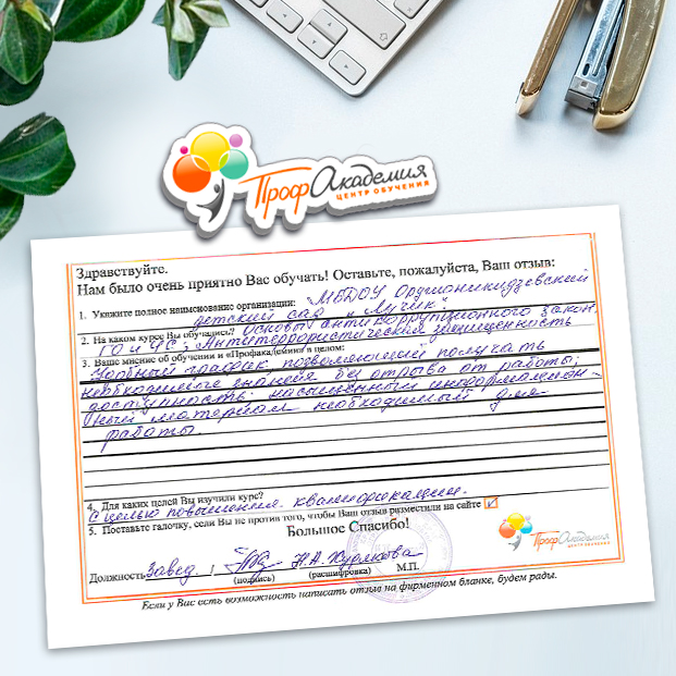 В ноябре месяце 2022 года я прошла 2 курса повышения квалификации. Понравился дистанционный режим обучения. После составления договора открыли доступ к курсам. Появилась возможность в свободное от работы время посмотреть занятия, лекции, видеозаписи, что немаловажно при плотной занятости на работе. Кроме того, предоставлена рабочая документация, которая необходима для разработки локальных документов. Спасибо вам большое. Елене Шляндиной особое спасибо за постоянную связь и оперативные действия. Желаю успехов!