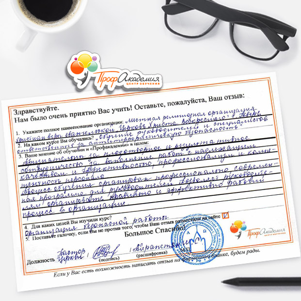 Признательны за плодотворное и результативное сотрудничество, за выполнение работ с надлежащим качеством и эффективностью, профессионализм и компетентность персонала. Процесс обучения организован профессионально, современная программа для руководителей. Позволяет руководителям организовать правильно и эффективно рабочий процесс в организации.